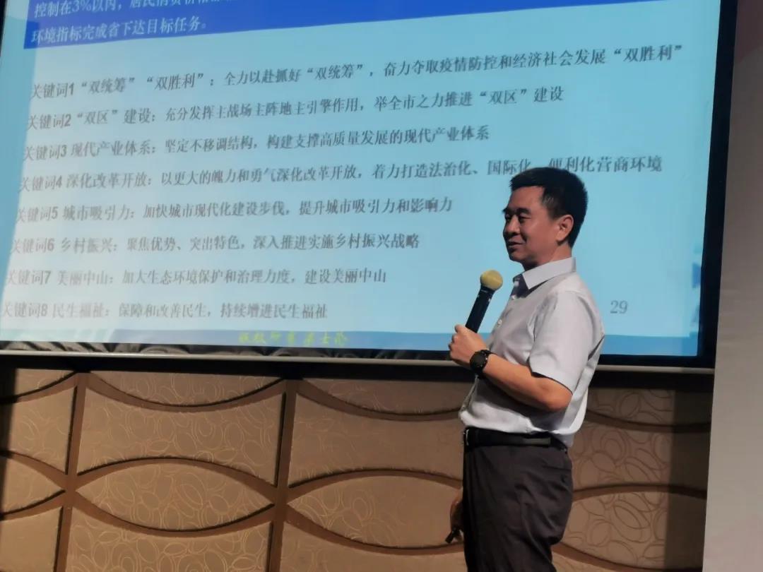 此次讲座邀请到中山经济研究院院长梁士伦进行授课,课上,梁士伦就全国“两会”精神进行详细解读,并作题为《后疫情时期中山企业发展危与机》的专题讲座。