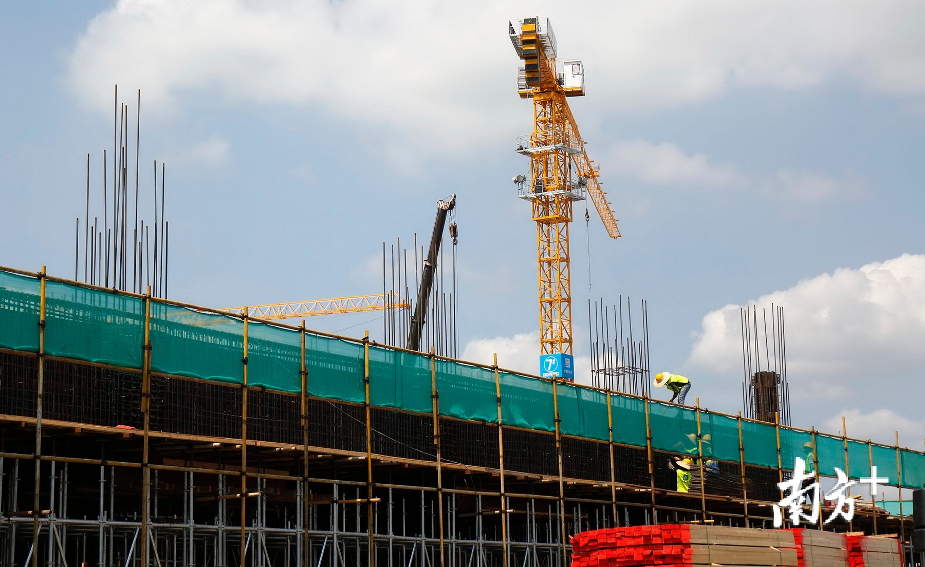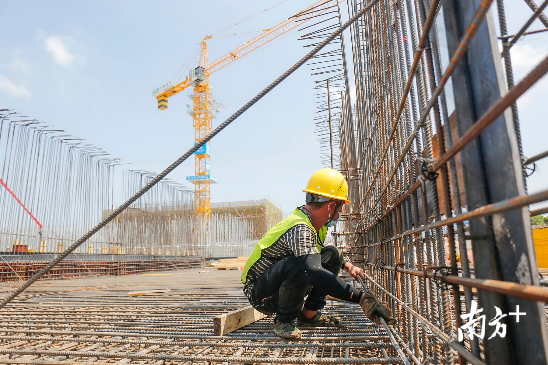 戴着亮黄色安全头盔的工人们,站在8号楼平台上绑扎钢筋,进行正负零施工。