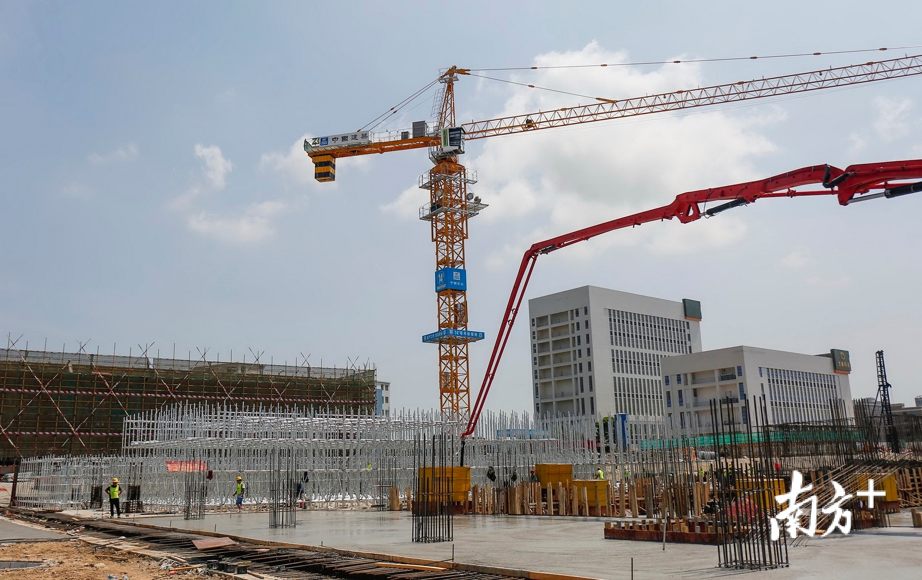 7台挖掘机进行承台开挖,15台锤击桩机进行工程桩施工,发出撞击与轰鸣声。场地中央,一台混凝土泵车伸出巨大而细长的臂架,混凝土从前端软管浇筑灌入10号楼底板。一旁,戴着亮黄色安全头盔的工人们,站在8号楼平台上绑扎钢筋,进行正负零施工。远处,塔吊吊送着模板、木方、架体。