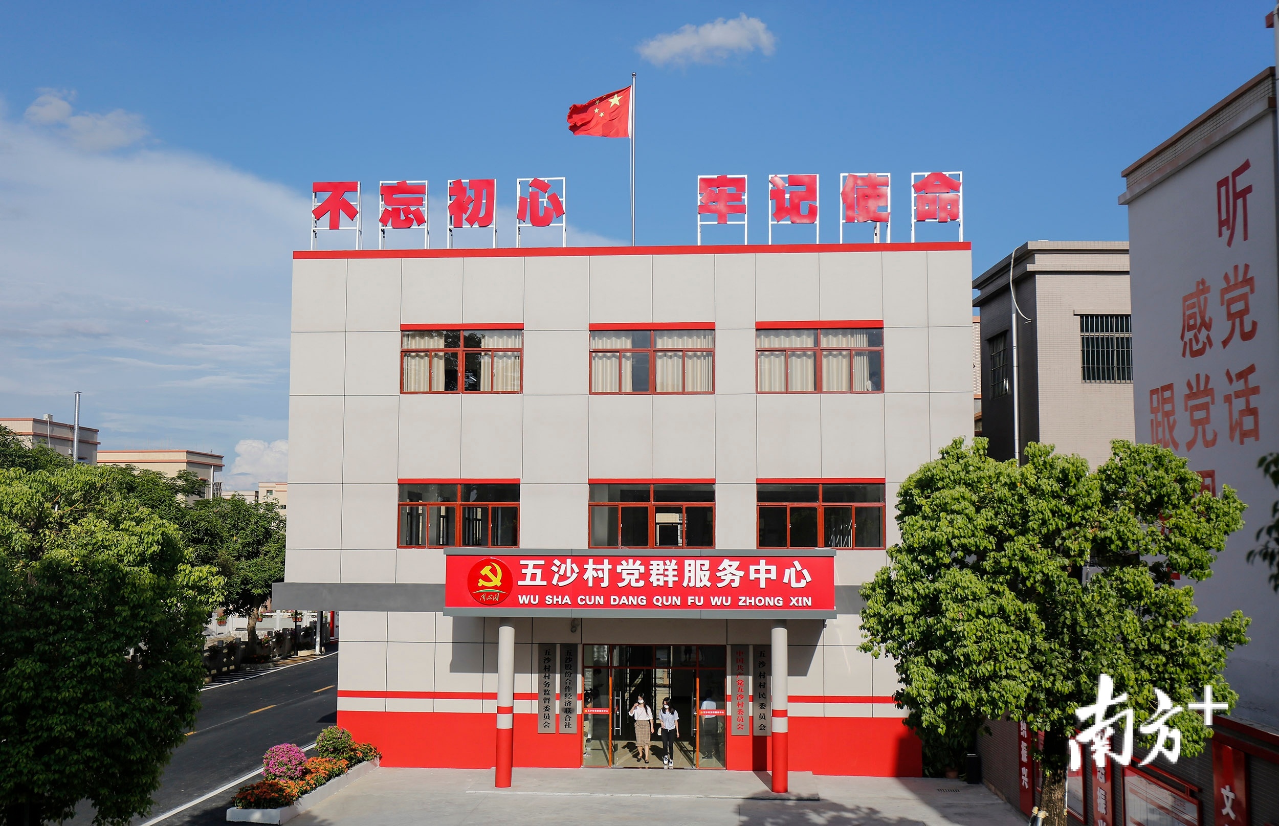 在横栏镇五沙村党群服务中心,繁花似锦的景象惹人驻足。