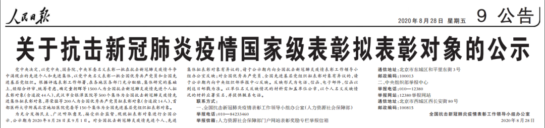 8月28日,人民日报发表了《关于抗击新冠肺炎疫情国家级表彰拟表彰对象的公示》。