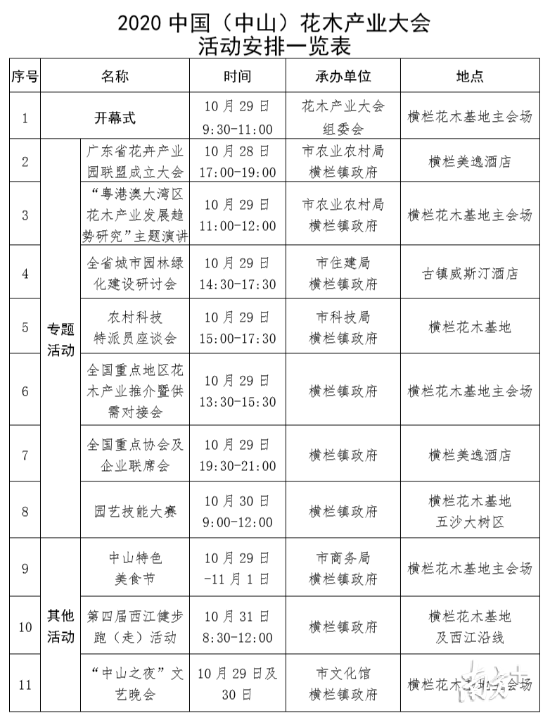 陈永华介绍,本届花木产业大会由广东省农业农村厅和中山市人民政府主办,中山市农业农村局和中山市横栏镇人民政府承办,策划了开幕式和15项活动,包括7项专题活动、4项特色展览和4项文体娱乐活动。其中,10月28日晚将举行广东省花卉产业园联盟成立大会,横栏镇成为首届理事长单位。