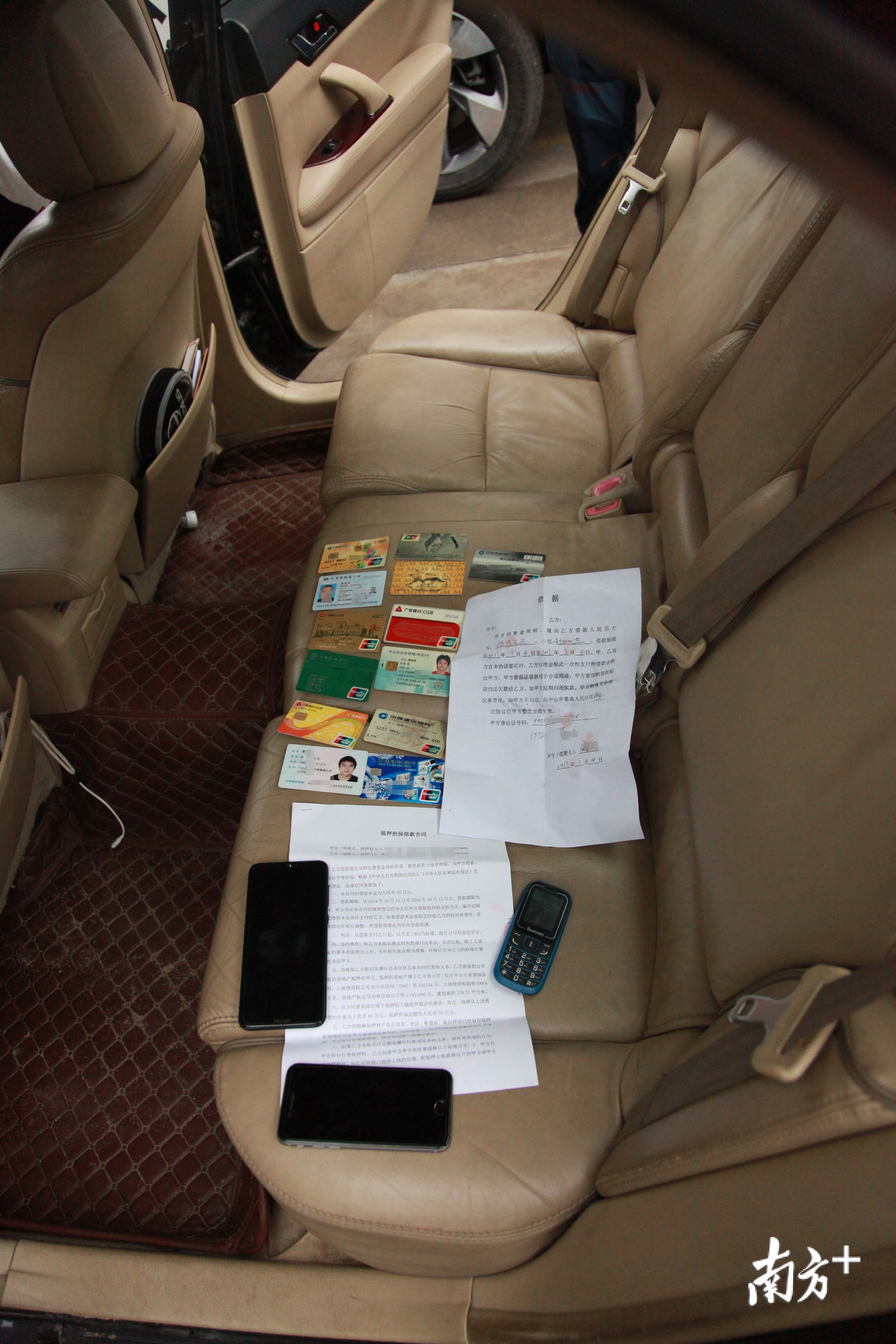 中山公安专案组调查黄圃黄某泉涉黑恶犯罪团伙期间,从车上搜获涉案银行卡和借款合同。