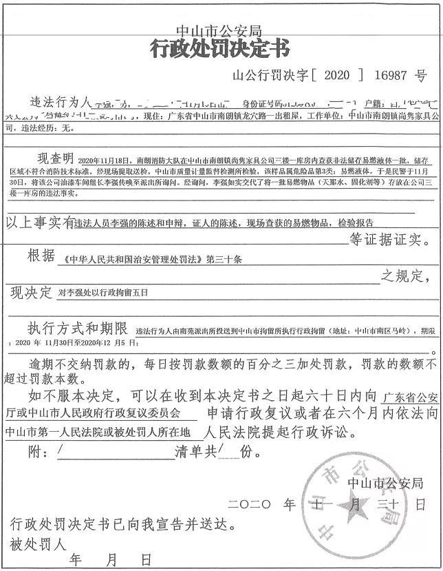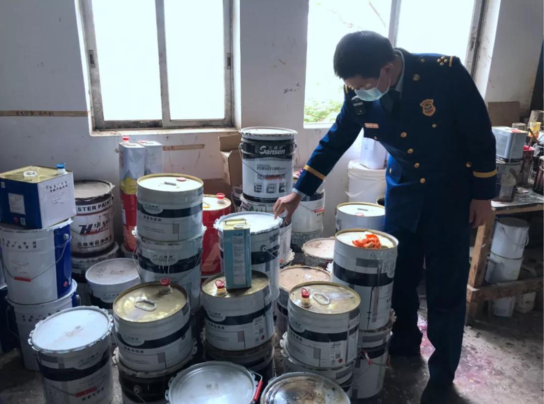 检查中发现,检查人员发现位于中山市南朗镇榄边工业区的尚隽家具有限公司公司涉嫌非法储存天那水、固化剂等易燃物品,储存区域不符合消防技术标准,存在较大的安全隐患。经中山市质量计量监督检测所检验,该物品属危险品第3类:易燃液体。