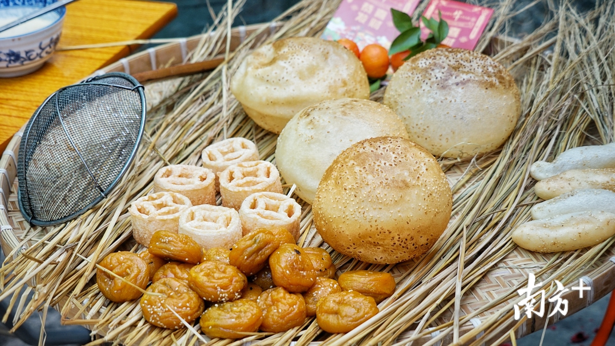 沙溪镇圣狮村村民制作的煎堆、金钱圈、油糍等年味食品。