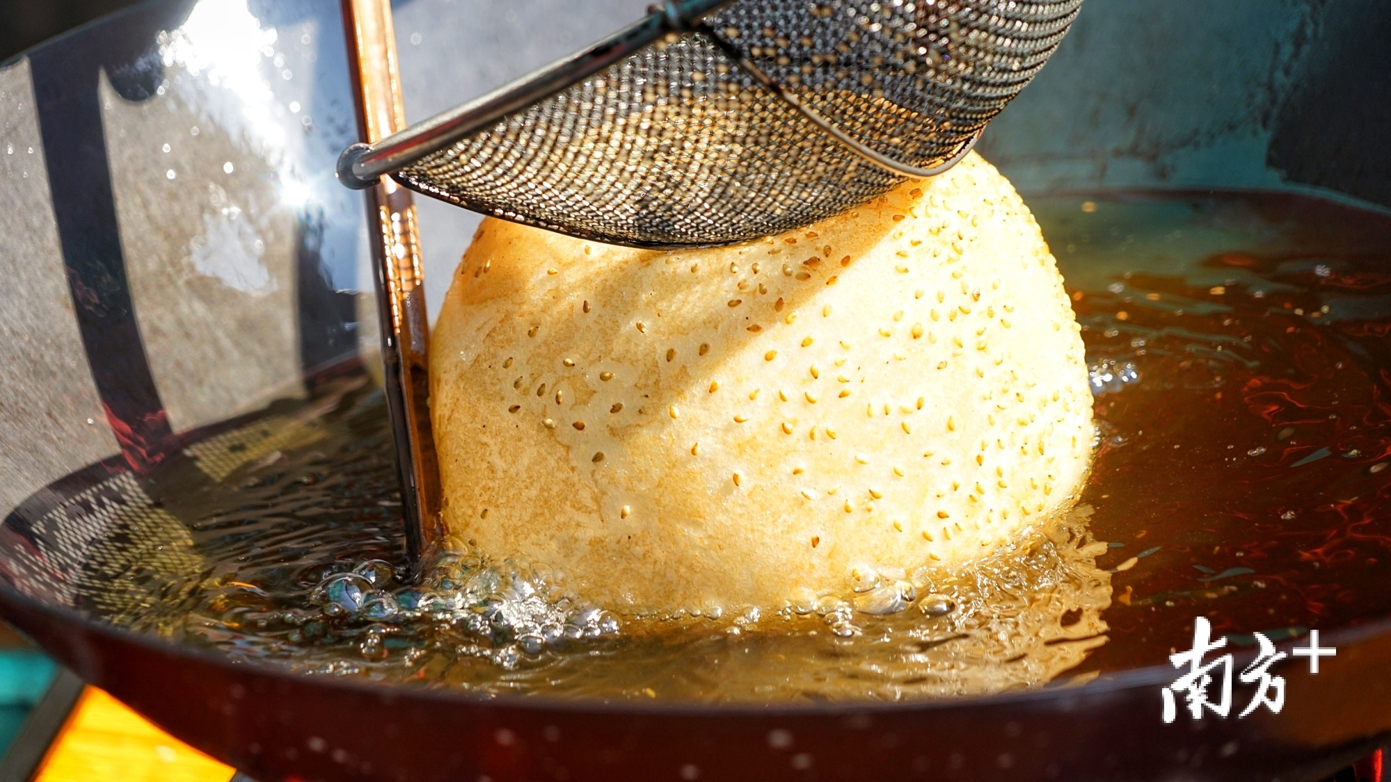 “这就是过年的味道。”大年三十,圣狮村村民杜润骄在家中小院中架起油锅,在邻居的帮忙下炸煎堆。只见油锅中的面团渐渐变大,一个圆鼓鼓的空心煎堆在油锅里慢慢地浮了起来。