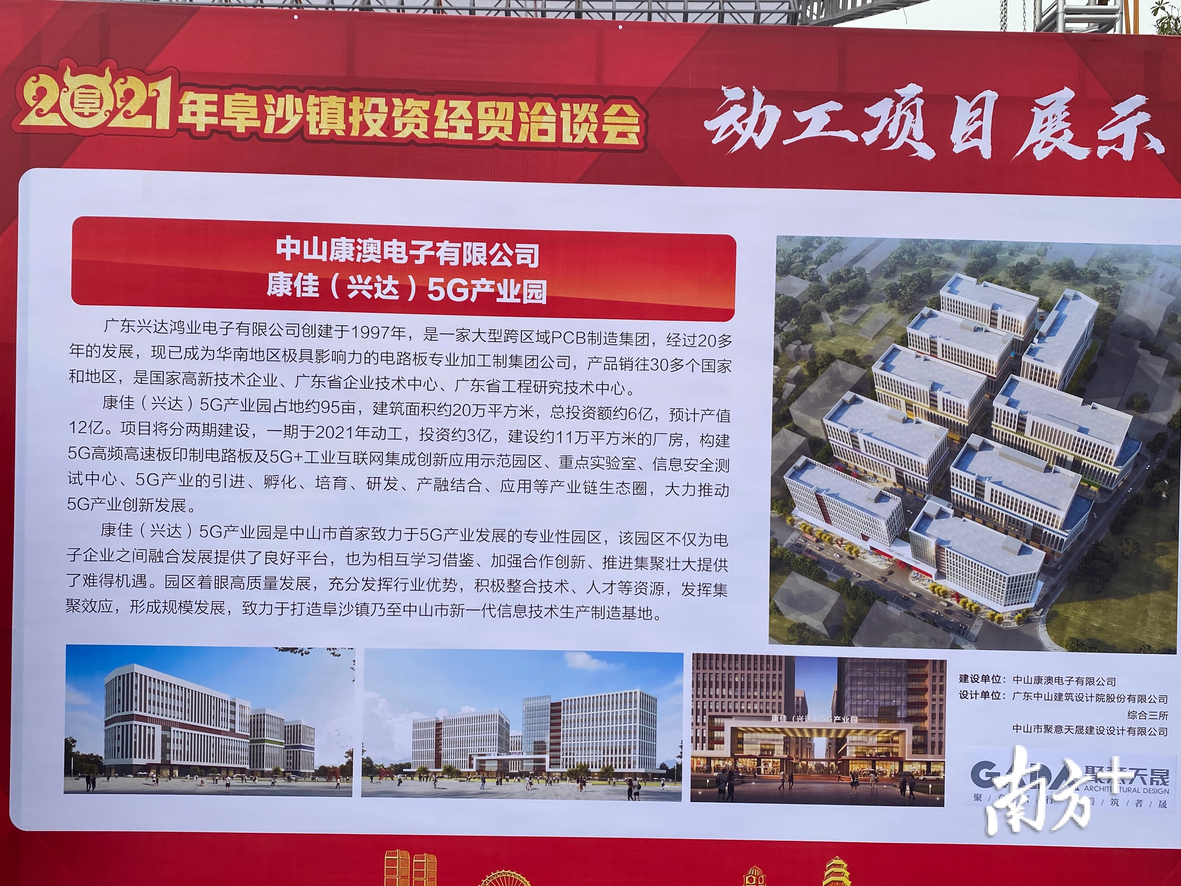 “康佳(兴达)5G产业园是全市第一家致力于5G产业发展的专业性园区。项目一期计划投资3.5亿元,占地50亩。”康佳集团股份有限公司副总裁孙清岩表示,“园区致力于打造阜沙镇乃至中山市新一代信息产业制造基地。该项目建成后可实现主营业务收入6.1亿元,税收3100万元,创汇1500万美元。”