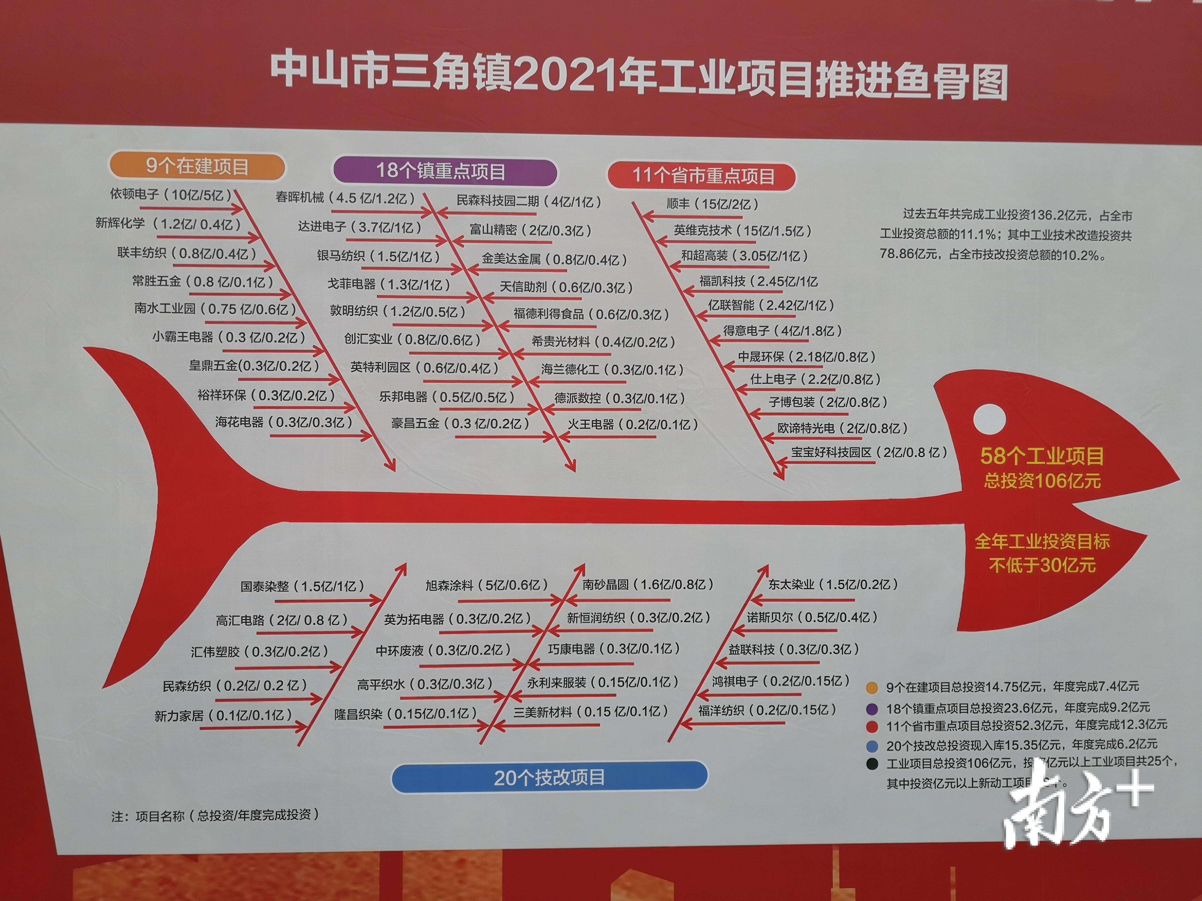 三角镇2021年工业项目推进鱼骨图。三角镇今年动工的纯工业项目达58个,投资超过100亿元。