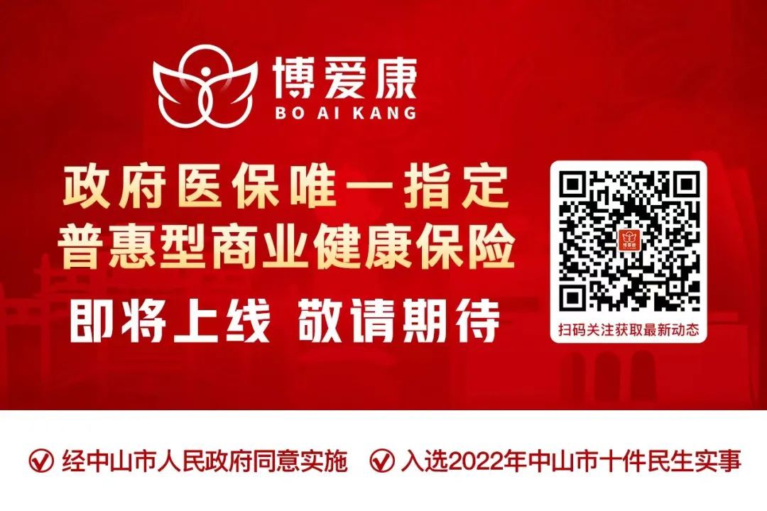 为健全多层次医疗保障体系,切实减轻群众医疗费用个人负担,经中山市人民政府同意,按照“政府指导、商业运作、惠民便民、自愿投保”的原则,中山市医疗保障局、中山市卫生健康局、中山市金融工作局、中国银行保险监督管理委员会中山监管分局、国家税务总局中山市税务局等五部门共同推出与基本医疗保险、大病保险、医疗救助等医疗保障基本制度互补衔接的中山特色普惠型商业补充医疗保险——“博爱康”,自2022年1月起实施。