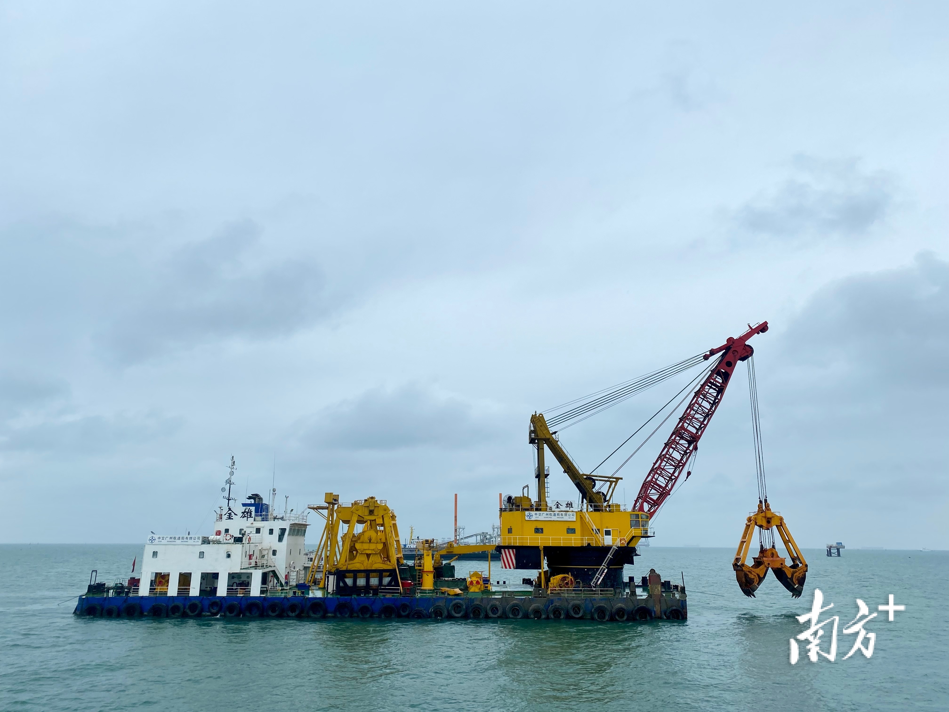 “开斗、定深、下放、咬合、闭斗、提升、装驳……”“金雄”轮大抓斗上下往复,将海底的淤泥挖起,为深中通道海底沉管隧道施工“打地基”。