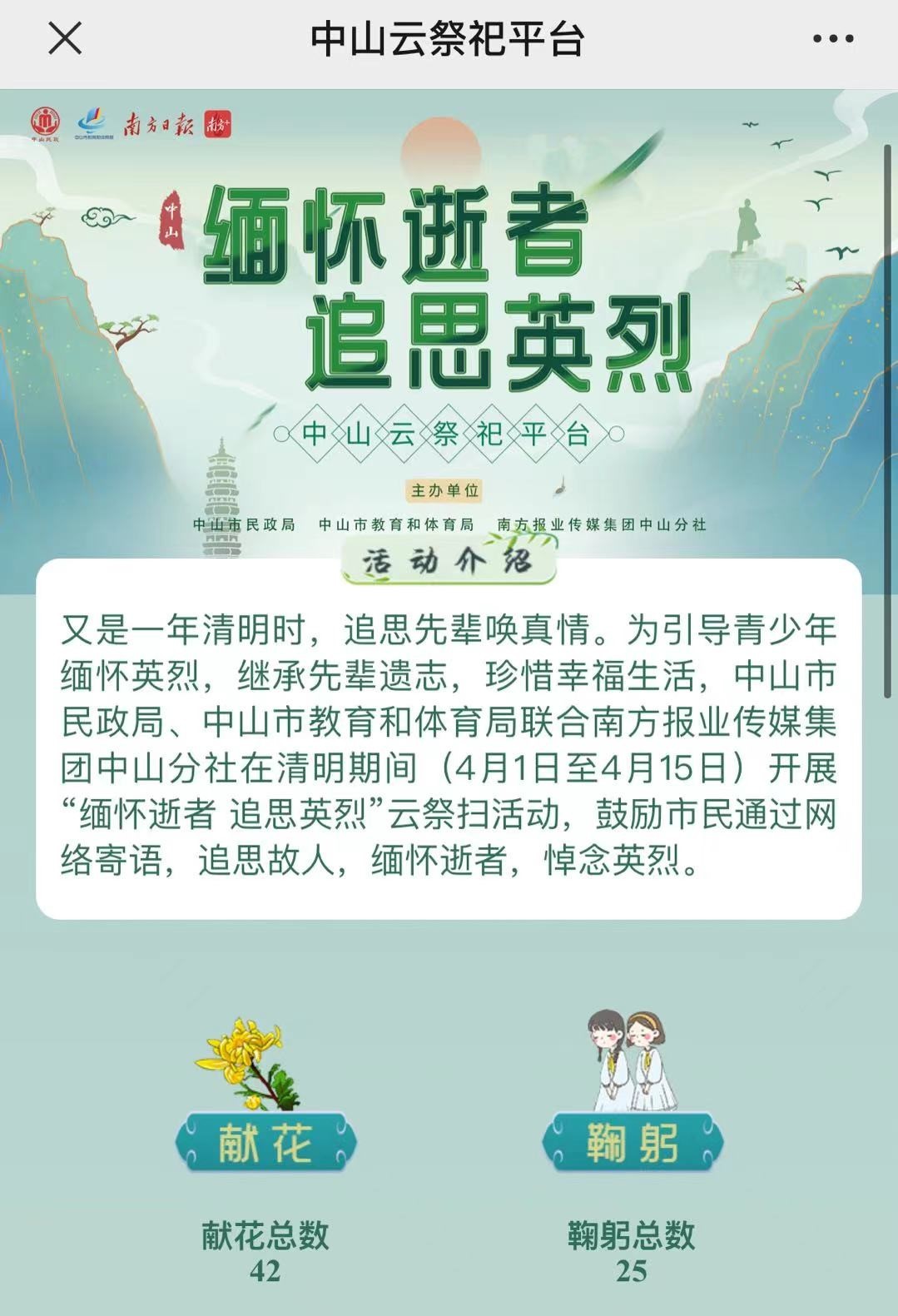 为引导青少年缅怀英烈,继承先辈遗志,珍惜幸福生活,中山市民政局、中山市教育和体育局联合南方报业传媒集团中山分社在清明期间(4月1日至4月15日)开展“缅怀逝者 追思英烈”云祭祀活动,鼓励市民通过网络寄语,追思故人,缅怀逝者,悼念英烈。