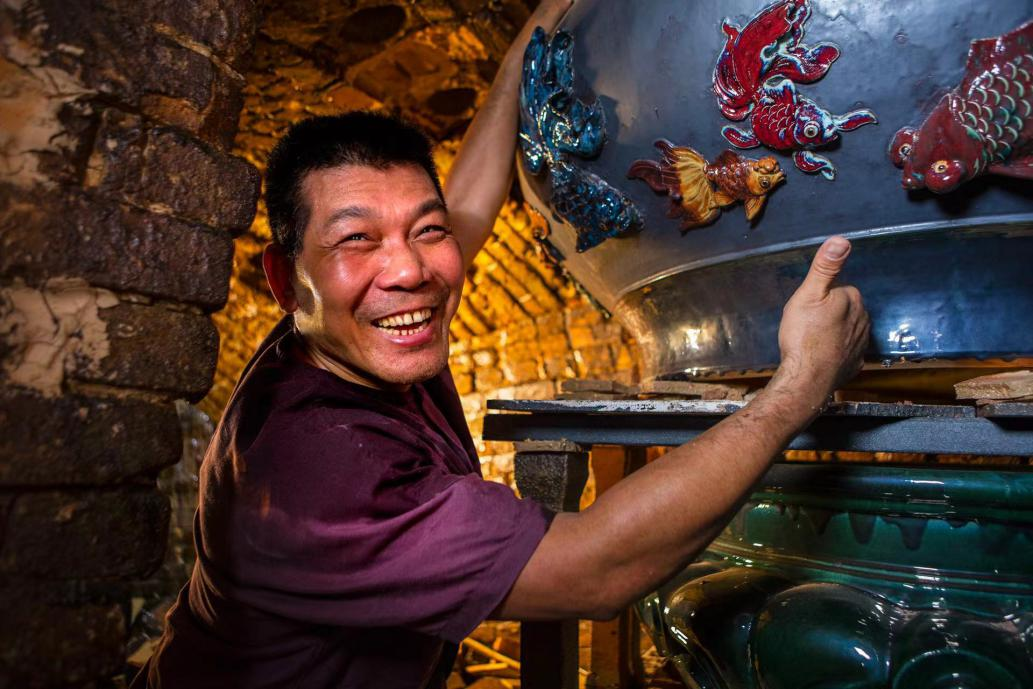 在小榄菊城陶屋,广东十大工匠何湛泉的执着“玩火”,使当今已鲜有的龙窑烟火不断。这口直径1.5米的大缸是他最近的得意之作。(摄影:张展)