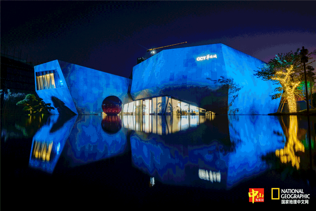 “山多石,水分歧”,在变化多彩的灯光渲染下,坐落于水景中央的中山华侨城城市展厅如梦如幻。(摄影:陈翀)