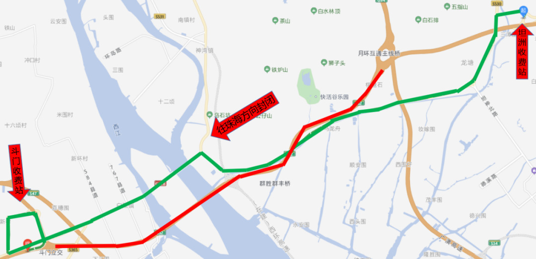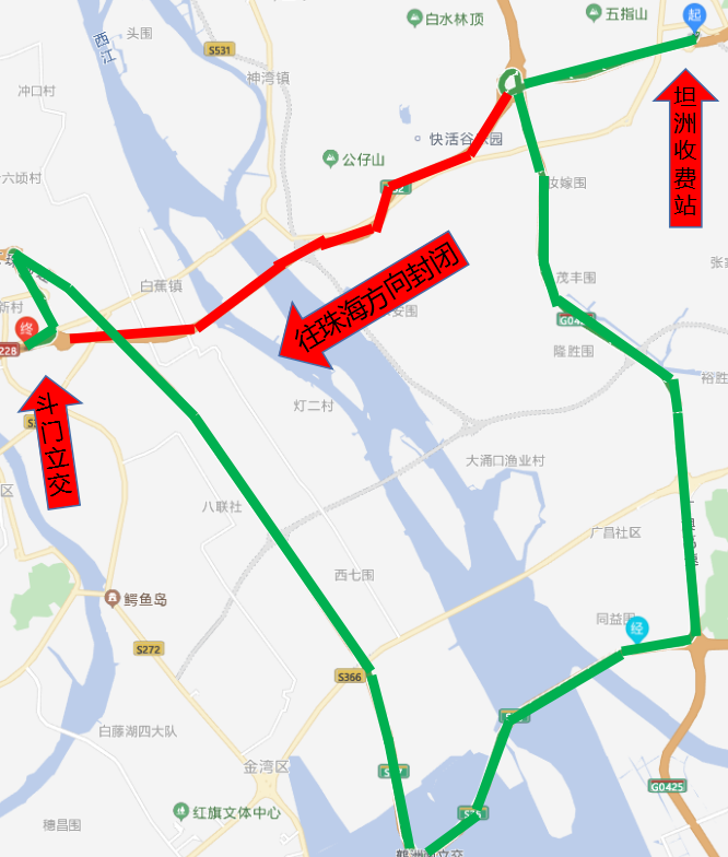 从坦洲收费站驶出→左转进入沙坦南路→坦神北一路→导航进入斗门收费站。