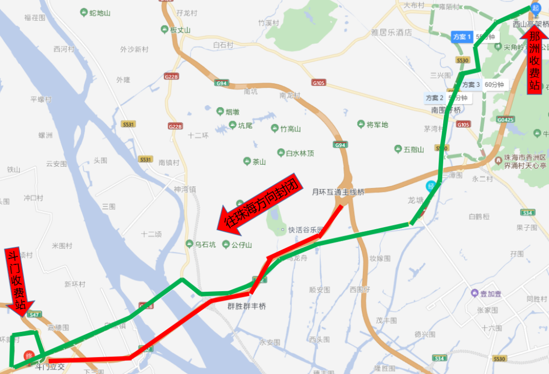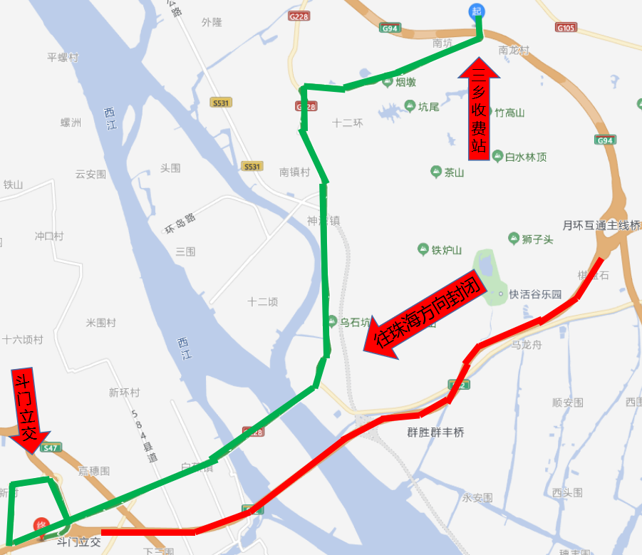 从三乡收费站驶出→右转进入南龙路→经G228国道→导航进入斗门收费站。