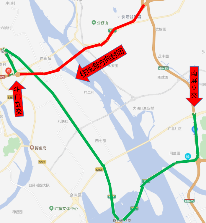 由坦洲收费站驶入→由月环互通右转进入广澳高速南行→经洪港高速→导航进入斗门立交。