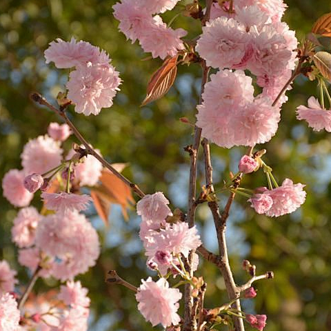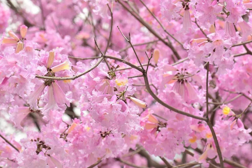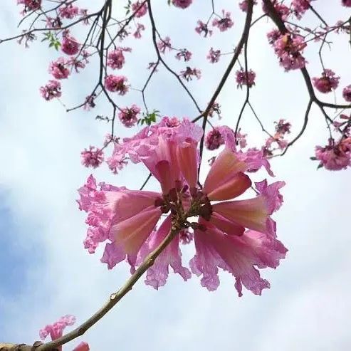 成簇的粉色花球挂在枝头,偶有微风触碰,婀娜摇摆,如梦似幻。