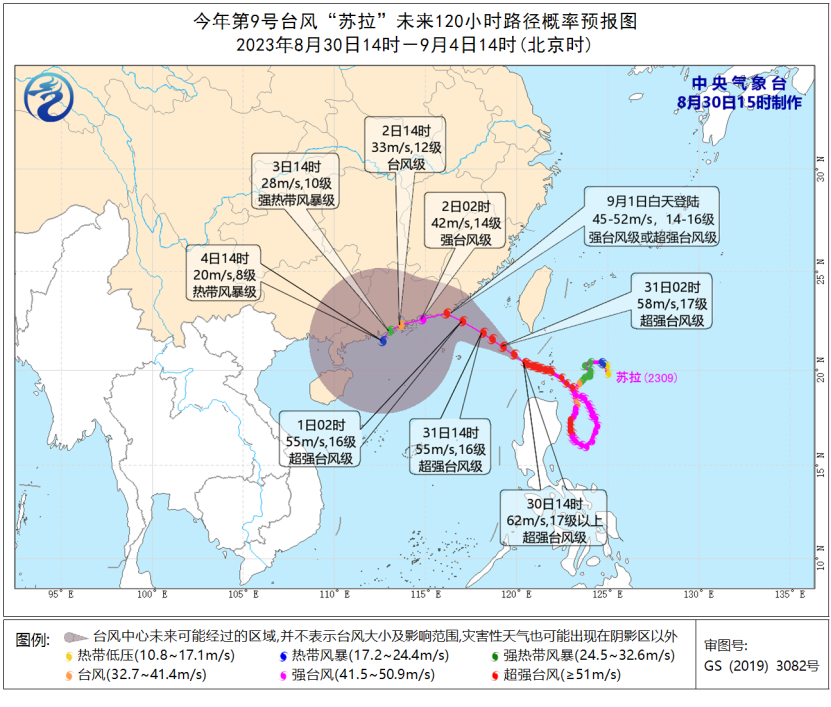 预计,台风“苏拉”将以每小时10到15公里的速度向西偏北方向移动,趋向我省中东部海面,强度缓慢减弱,将以强台风级于1日夜间到2日上午在惠东到台山一带沿海登陆,或在我省东部近岸海面折向西偏南方向移动。受其影响,中山市将有一次明显风雨过程,中山市气象台2023年9月1日6时11分将台风预警信号升级为橙色。