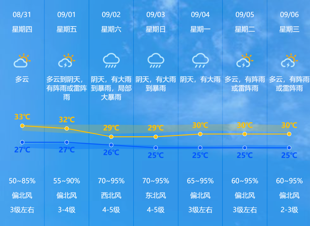 受台风“苏拉”环流影响,预计8月31日中山市以多云为主,天气趋于炎热;9月1日夜间至4日,中山市有一次暴雨局部大暴雨降水,过程累计雨量150-250毫米,平均风力5-7级,阵风8-10级。据气象部门报告,台风“苏拉”个头小、强度强,其与“海葵”产生的双台风互旋效应,进入南海后的路径仍有不确定性,但对中山都有明显风雨影响,需及时做好防御准备。
