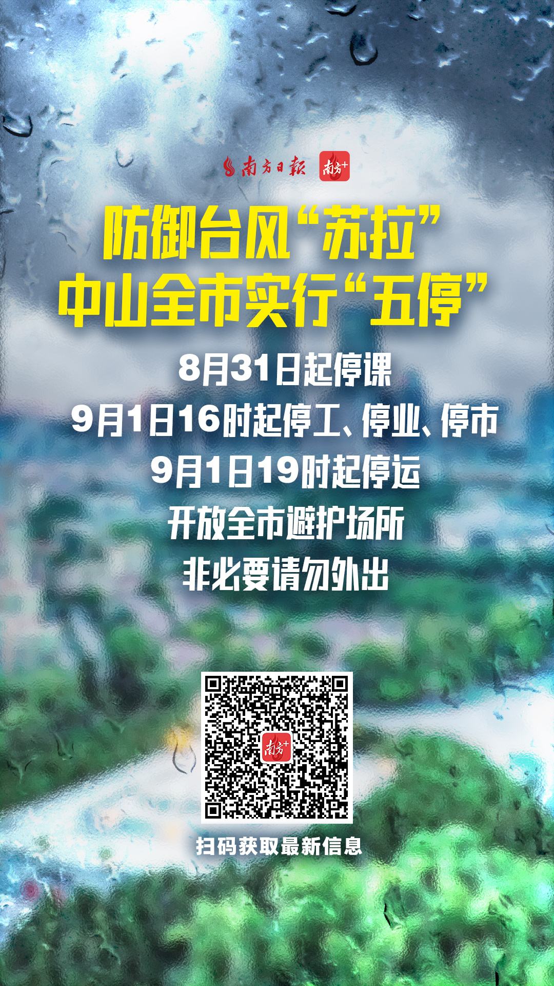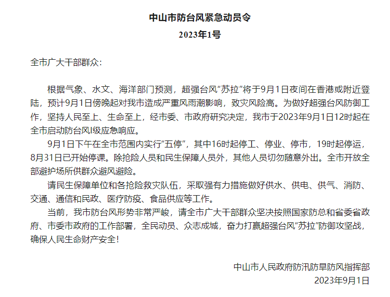 为做好超强台风防御工作,坚持人民至上、生命至上,经市委、市政府研究决定,中山市于2023年9月1日12时起在全市启动防台风I级应急响应。9月1日下午在全市范围内实行“五停”,其中16时起停工、停业、停市,19时起停运,8月31日已开始停课。除抢险人员和民生保障人员外,其他人员切勿随意外出。全市开放全部避护场所供群众避风避险。