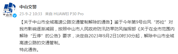 中山交警发布通知,自2023年9月2日10时30分起,解除中山市全域高速公路的交通管制,内容如下: