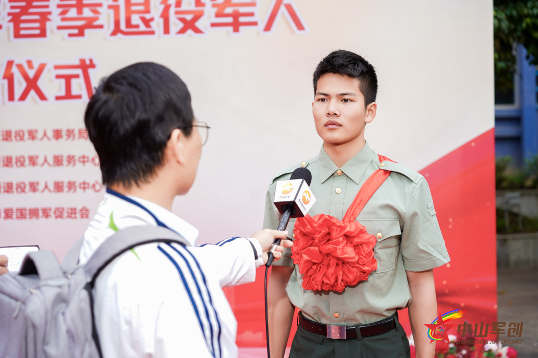▲优秀退役士兵冯坤代表2023年中山市春季退役士兵在市欢迎仪式上发言。