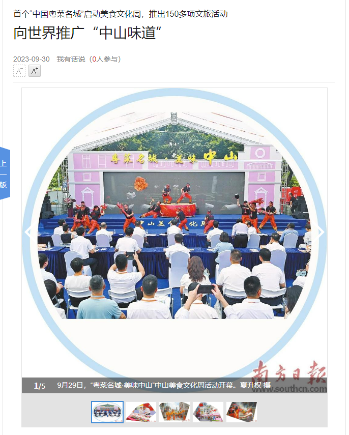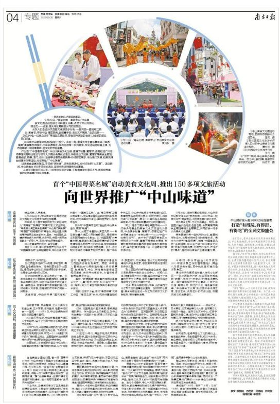 9月29日,《南方日报》以整版的篇幅报道《首个“中国粤菜名城”启动美食文化周,推出150多项文旅活动 向世界推广“中山味道”》聚焦中山美食文化周,同时介绍了中山“文化育村行动”,对中山倾力打造“香山之夜”文化艺术品牌,持续开展“稻田音乐会”“村晚”等特色活动;加强咸水歌、菊花会、醉龙舞等非物质文化遗产保护开发,守住乡村文化根脉;丰富乡村文化生活,支持鼓励社会开展粤剧、武术、龙舟等传统文体和各类民俗活动,推广“村BA”、“村超”、全民健身等群众文化体育活动等举措做了相关报道,点赞中山通过推广“乡村+节庆”“乡村+文创”“乡村+美食”等发展模式,让群众及游客来中山有常驻演出可看、有文旅项目可玩、有特色美食可享。