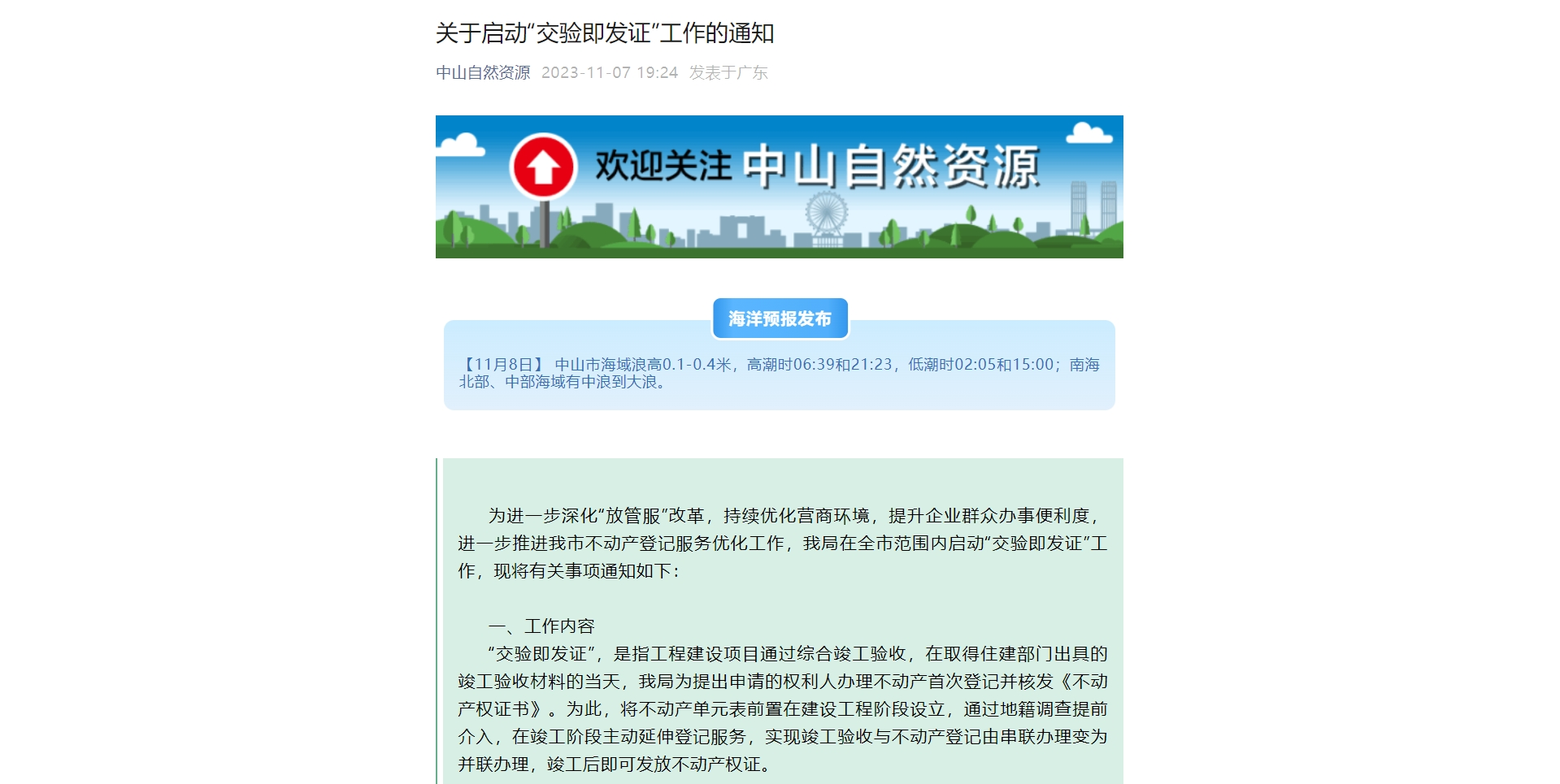11月7日,中山市自然资源局发布《关于启动“交验即发证”工作的通知》(下称《通知》),在全市范围内启动“交验即发证”工作。