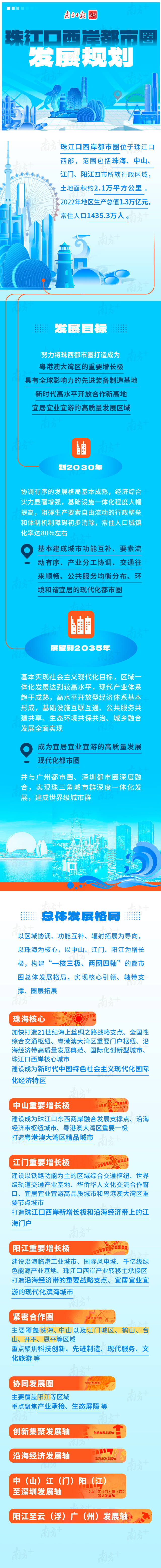 《发展规划》明确,珠西都市圈涵盖珠海、中山、江门、阳江四市所辖行政区域,陆域面积约2.1万平方公里,2022年地区生产总值1.3万亿元,常住人口1435.3万人。珠西都市圈将形成以珠海为核心,以中山、江门、阳江为增长极,构建“一核三极、两圈四轴”的都市圈总体发展格局,打造成为粤港澳大湾区的重要增长极、具有全球影响力的先进装备制造基地、新时代高水平开放合作新高地、宜居宜业宜游的高质量发展区域。