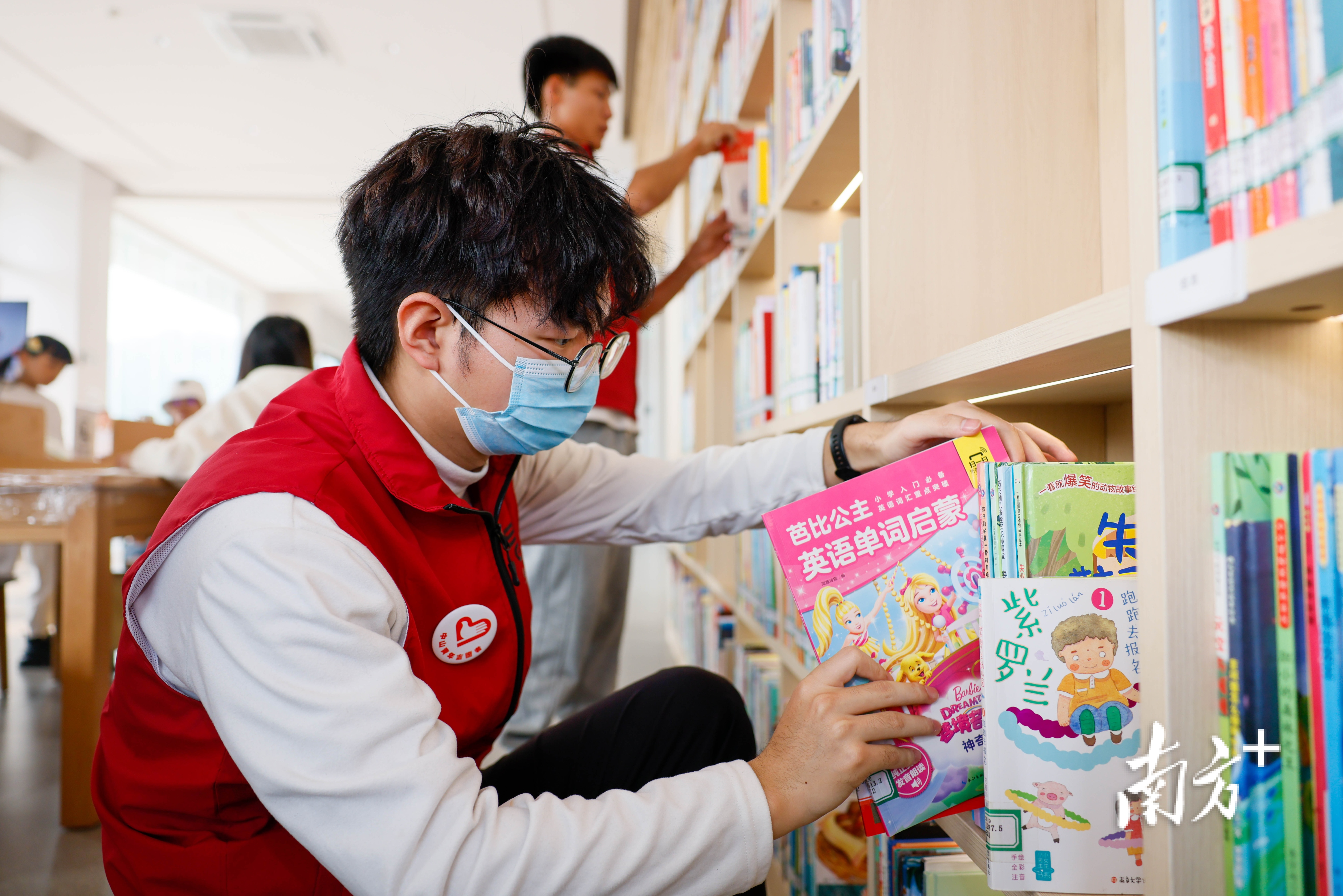 青年志愿者在金钟湖公园香山书房内整理书籍。 南方+ 卢子衡 拍摄