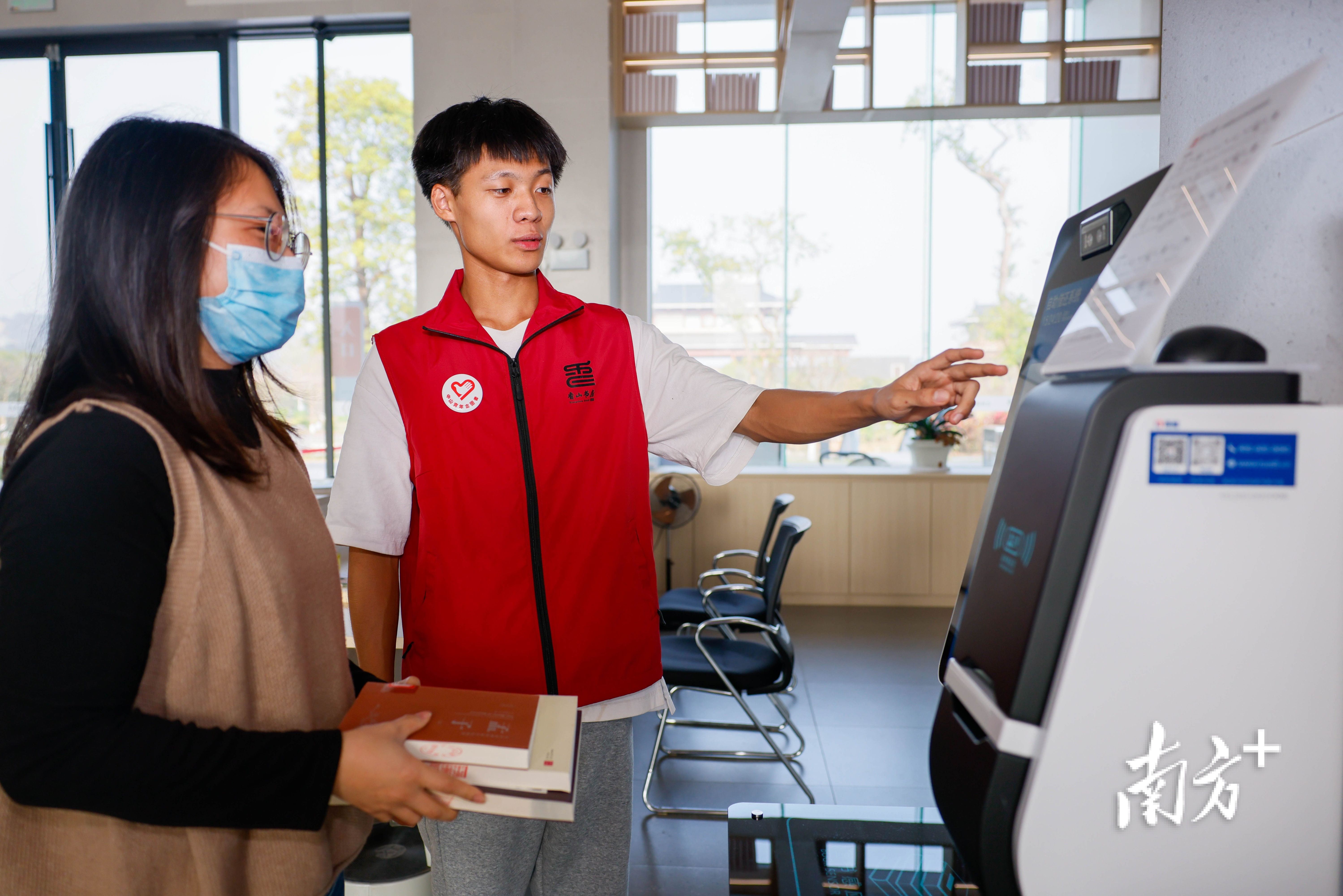 “有时候读者不太明白怎么借书、还书,我们就会及时上前提供帮助,指导他们在借阅机处扫描书籍、完成借阅或还书,这些流程,我们都很熟练了。”刘庸鑫说。