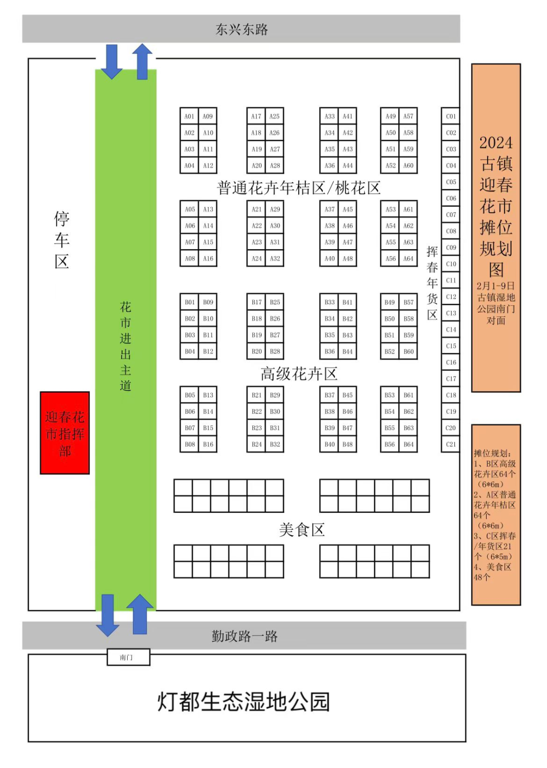 其中,设高级花卉区64个、普通花卉年桔区/桃花区64个、挥春/年货区21个和美食区48个,共约197个摊位。