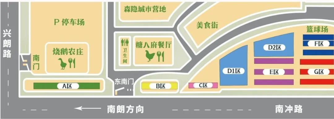 精品花卉区、年货区、露天花卉区、新春装饰区、非遗美食区、四方美食区、年货采购区、灯光观赏区、咖酒露营区、节目表演区、趣味游戏区、互动巡游区等,共约100个摊位,现场还特别设置了美陈打卡点~