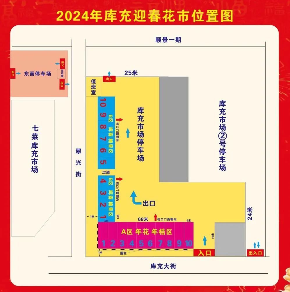 2024年库充商业街迎春花市面积约800平方米,预计有约20个摊位,挥春、糖果、年花等应有尽有。