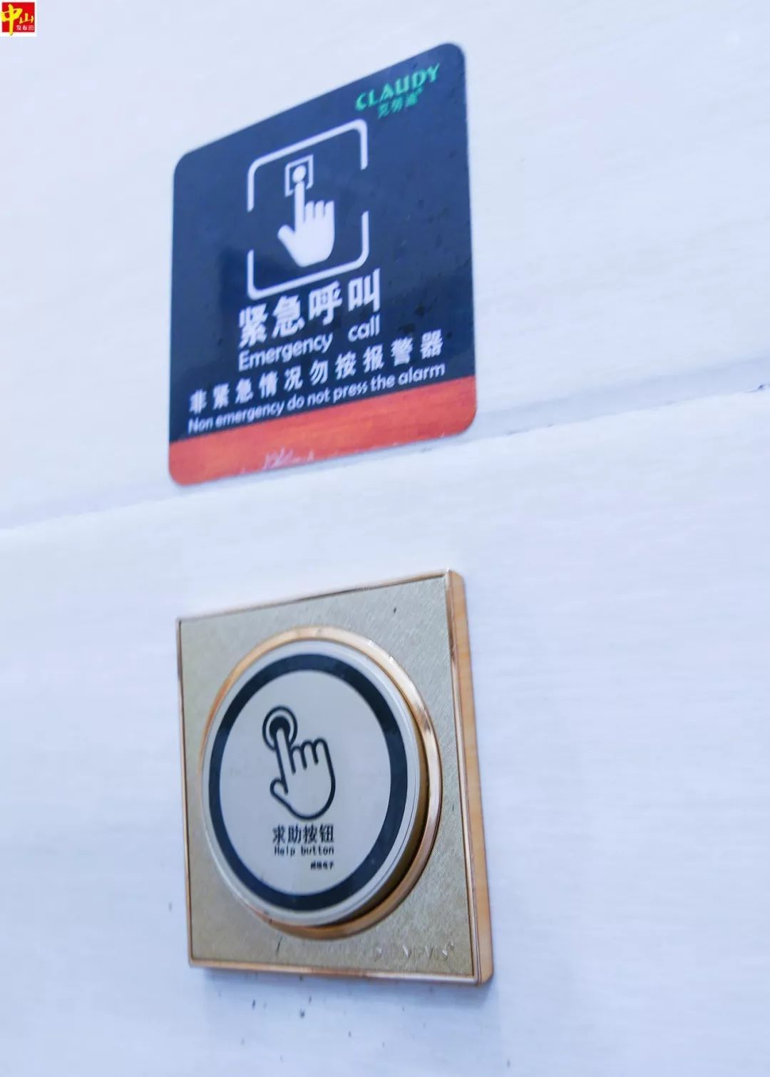 厕所内部,自动感应冲水器、一键报警按钮、整套安全扶手、除臭喷香设备、一次性坐便垫纸及消毒液等一应俱全。