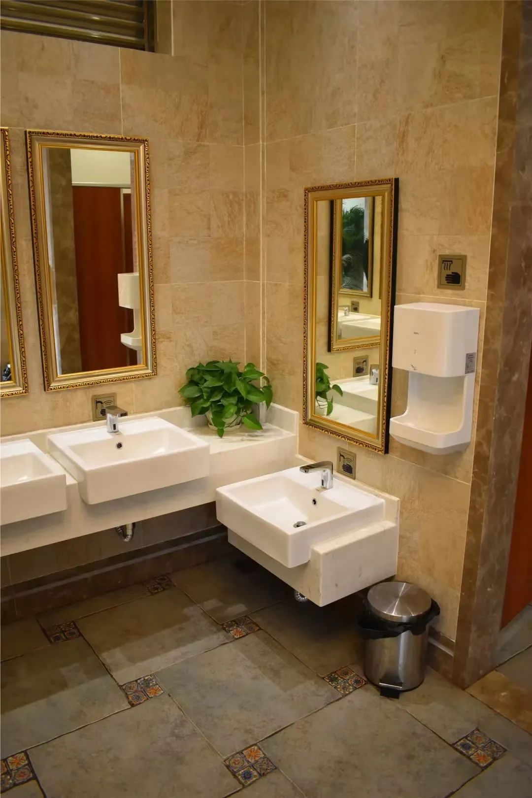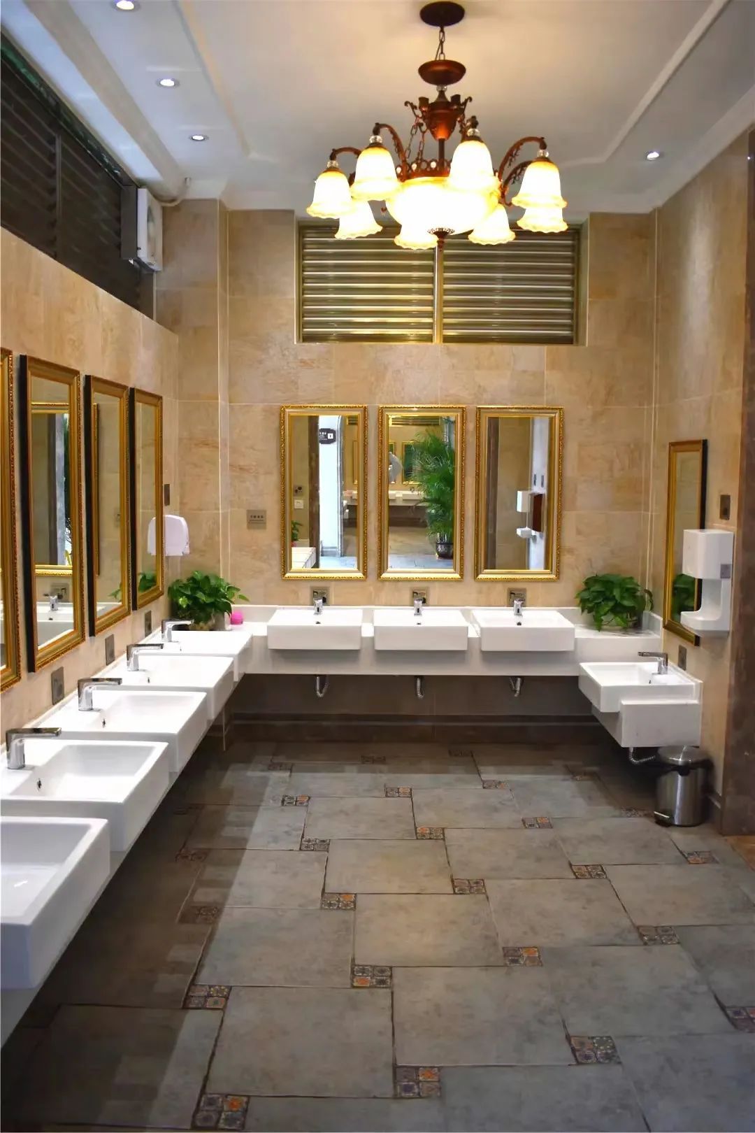 咖啡色的厕所风格“高端大气上档次”,超大的洗手台镜子,自带打光效果的顶灯,星级酒店厕所既视感。