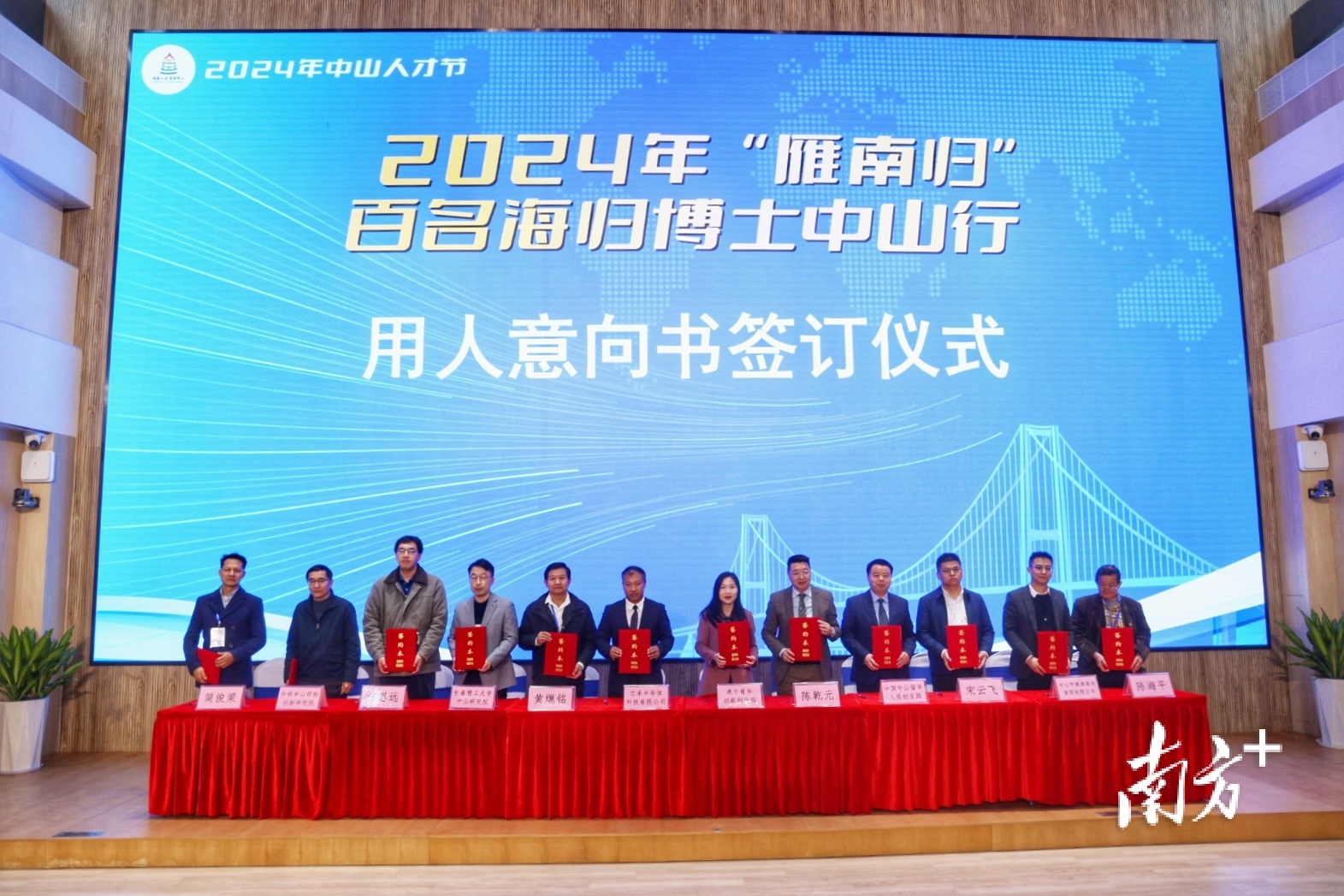 据了解,由中山市人才工作领导小组指导、中山市委组织部、市侨联、市人社局共同主办,中山市海外归国人员创业协会等承办的“雁南归”百名海归博士中山行,是在全省高质量发展大会、中山市高质量发展大会之后,2024年第十一届中山人才节首场子活动,更是2024年开春之后全省首场大型侨界引才活动。当天推介会上,中山市委人才工作领导小组办公室发布十大产业集群招贤令(下称“招贤令”),向全球人才发出热情邀请,诚挚欢迎各界优秀人才和有志青年来中山创新创业、投资兴业。两位落户中山的海归博士东君伟、潘洪辉分享了在中山创新创业的成功体会。6名海归博士分别与上药所中山研究院等6个用人单位签订意向书。