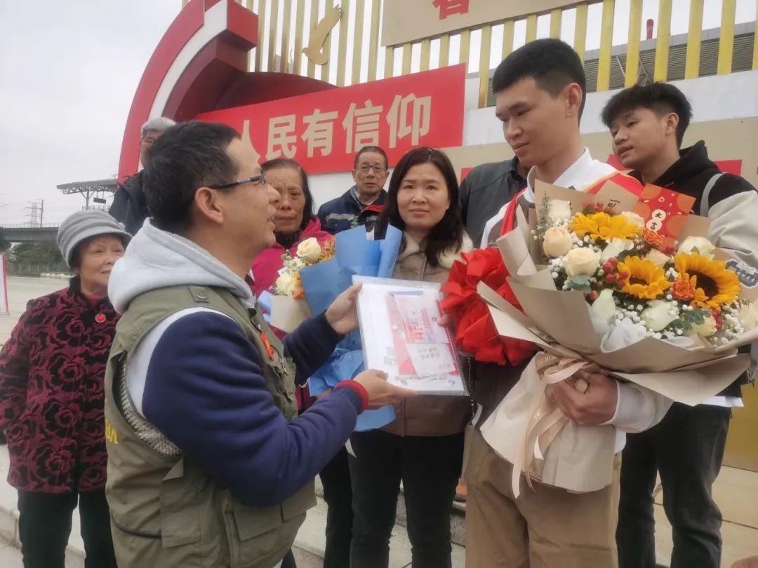 在简短的欢迎仪式上,退役返乡士兵披上了绶带,戴上了大红花,并收到了精心准备的欢迎礼包(《2024年退役士兵教育培训和就业创业服务指南》)和鲜花。横栏镇通过满满仪式感,营造“入伍光荣、退伍荣耀”的浓厚社会氛围,使退役返乡士兵真真切切地感受到家乡人民的热忱。