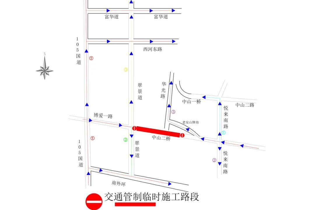 1.105国道北行车辆禁止转入博爱路,可以绕行南外环路或者富华道、北外环路。