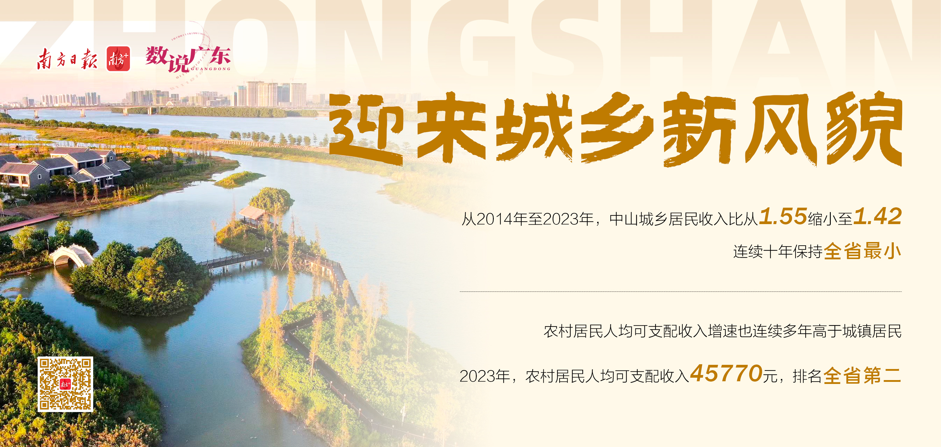 国家统计局中山调查队数据显示,2023年中山城乡居民收入比达1.42,自2014年广东城乡一体化住户调查改革以来,连续十年保持全省最小。从2014年至2023年,中山城乡居民收入比从1.55缩小至1.42,农村居民人均可支配收入增速也连续多年高于城镇居民。