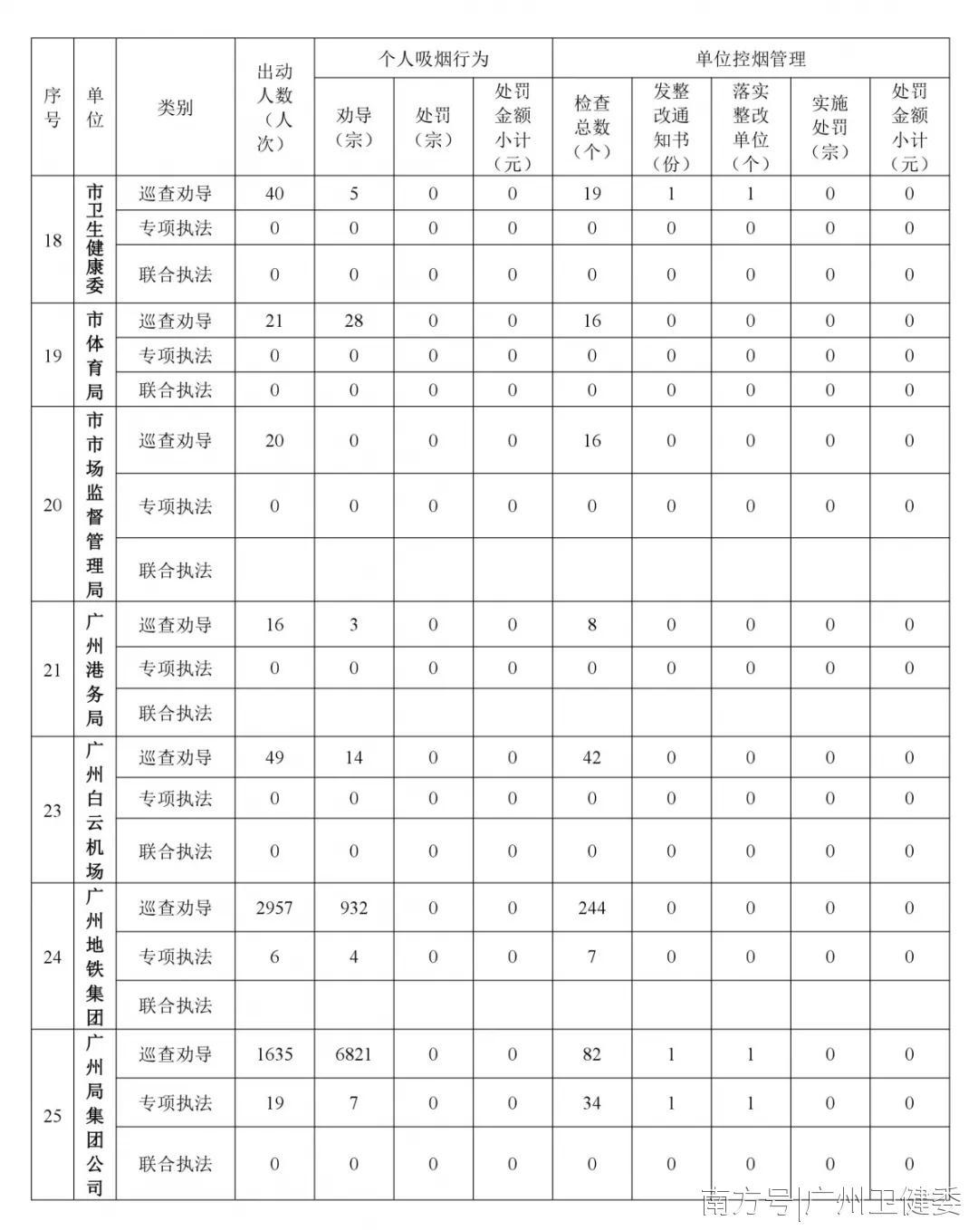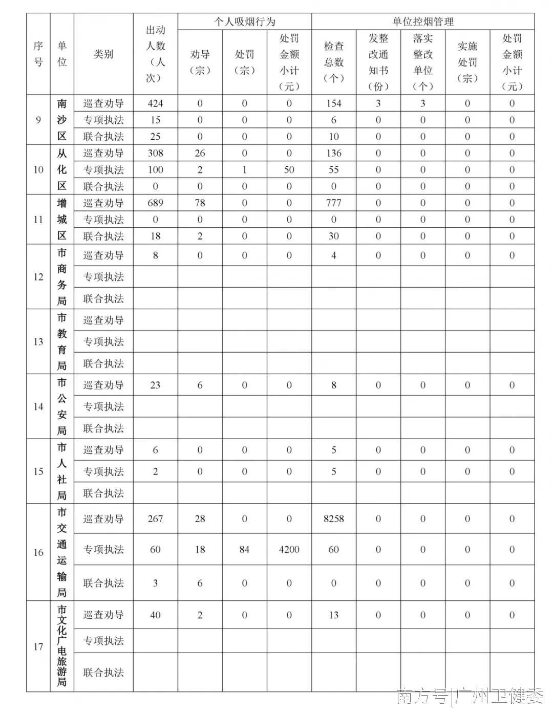 本月控烟执法行政处罚包括:花都区卫生监督所对1家单位作出警告;越秀区卫生监督所处罚写字楼个人违法吸烟行为3宗;海珠区食药监局餐饮场所处罚个人违法吸烟行为2宗;天河区食药监局餐饮场所处罚个人违法吸烟行为3宗;从化区文化广电新局网吧处罚个人违法吸烟行为1宗;市交通运输局交通场所处罚个人违法吸烟行为84宗。2月为学校寒假期间,市教育局申报为零。