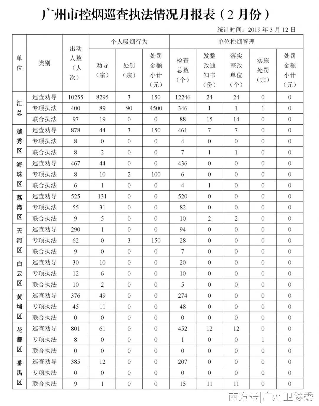 2019年2月,全市控烟巡查执法共出动10752人次,检查场所12680个,劝导个人违法吸烟行为8403宗,对未落实控烟措施、履行劝阻义务的公共场所发出整改通知书40份,共处罚个人违法吸烟行为93宗,行政处罚单位1宗,罚款金额共4650元。