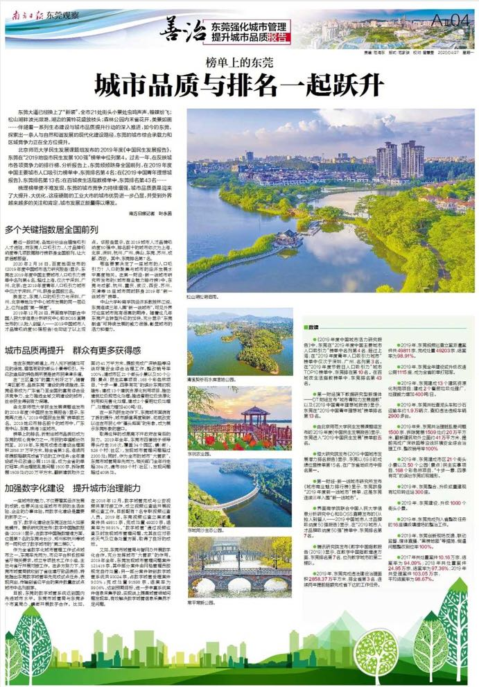 在以“写意画”勾勒出城市发展框架格局的同时,东莞还努力在城市精细化治理上下功夫,精心描绘城市品质提升的“工笔画”。去年,全市共治理“两违”2858.37万平方米;推进“厕所革命”,新建、改造升级1115座公厕;推进“洁净城市”,将按照中心区的标准,推进城市精细化管理下沉村(社区);推进“点睛亮景”,以中心广场及周边区域为核心区,通过绿化景观提升打造了“十里迎宾景观带”,使之成为市民“打卡”的“网红景点”。