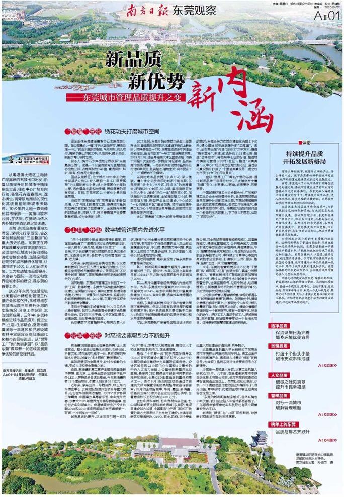 当前,东莞迎来粤港澳大湾区、深圳先行示范区、省改革创新实验区“三区叠加”的重大历史机遇。东莞正在跨越高质量发展攻坚期的关口,必须坚持以城市升级引领经济社会综合转型,加强空间规划管控和城市精细化管理,让城市留下记忆,让人们记住乡愁。大力推动城市品质提升、深度参与国际一流湾区和世界级城市群的建设,是东莞的首要工作。