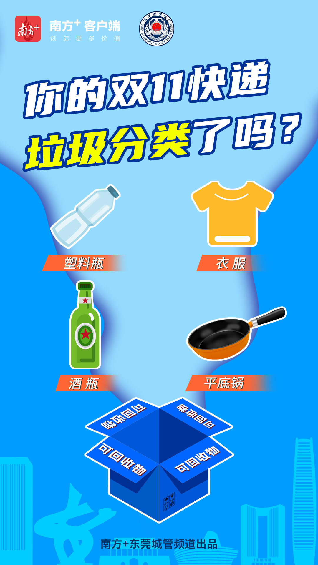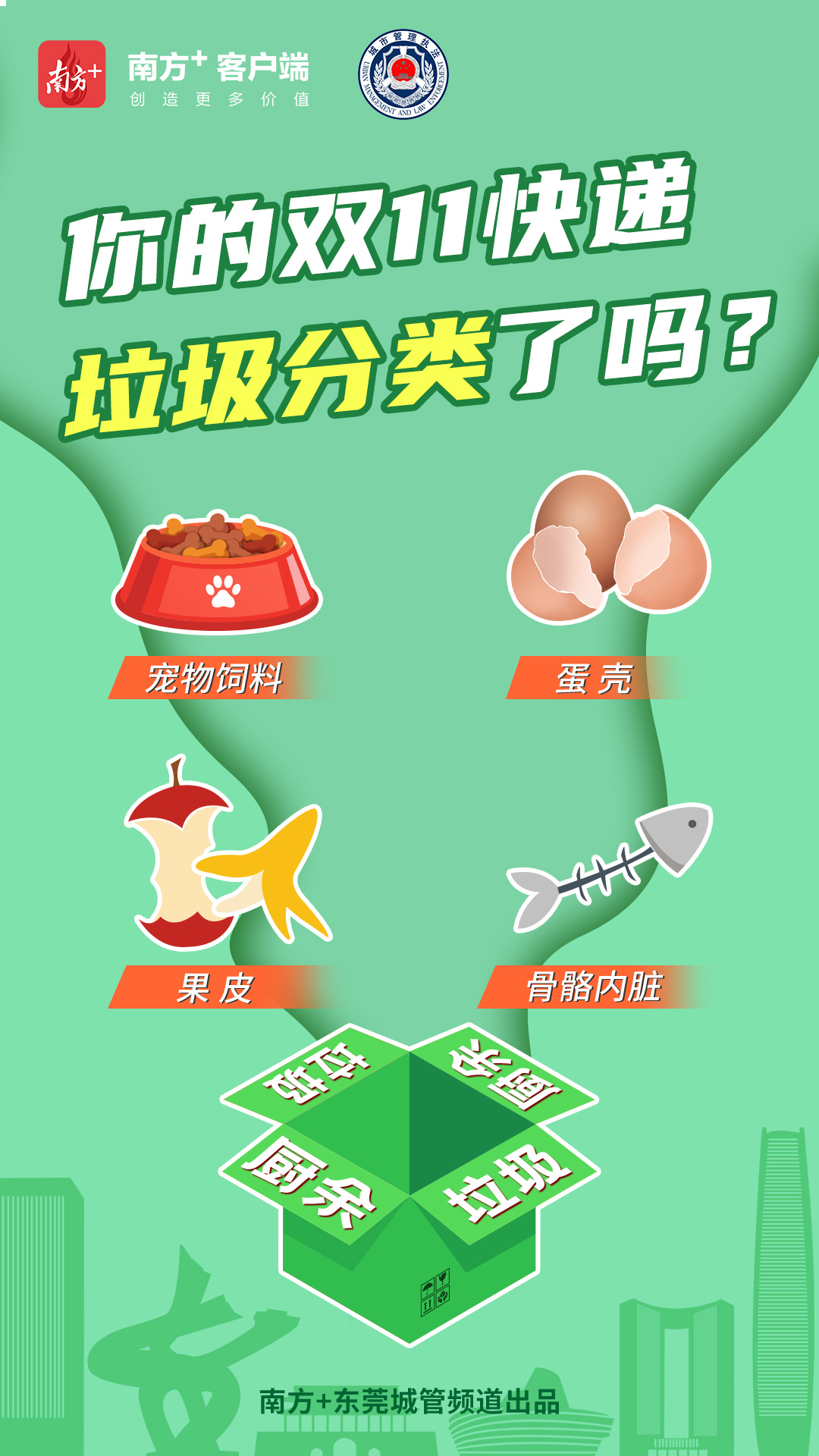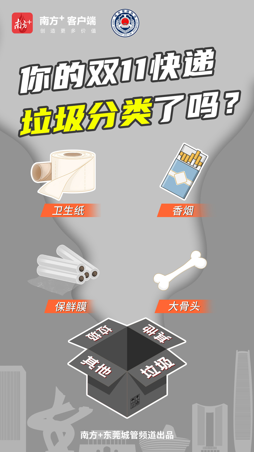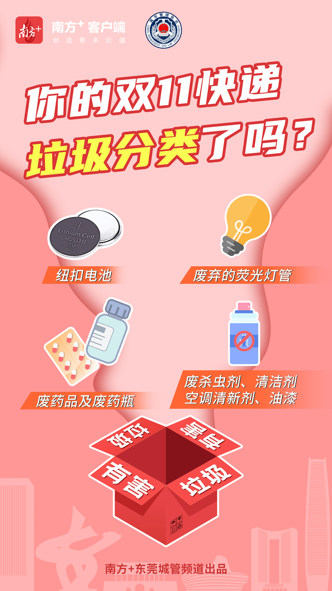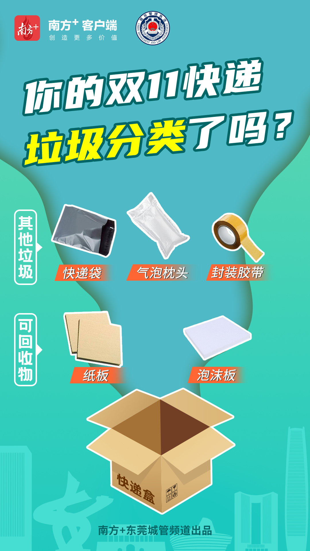 本期《城·管》系列,将采用5张海报,以快递盒为元素,推广东莞生活垃圾分类知识点。无论你的快递盒里装的是什么,产生了什么垃圾,都可以找到合适的投放位置,赶快收藏学起来吧!