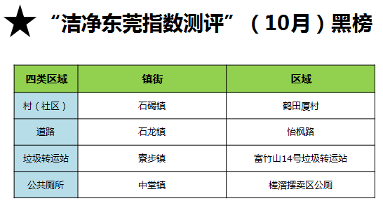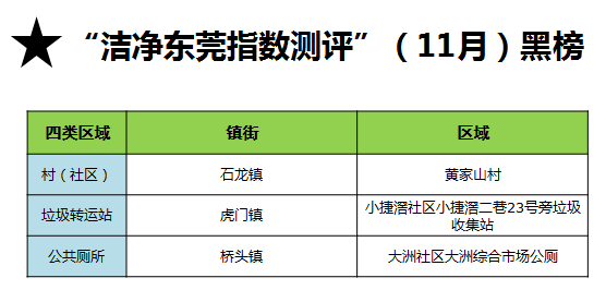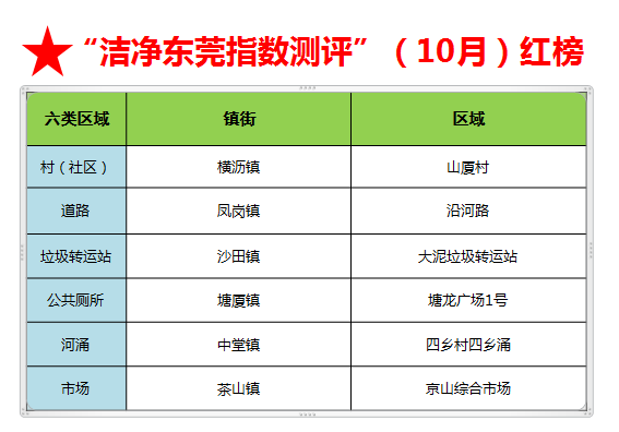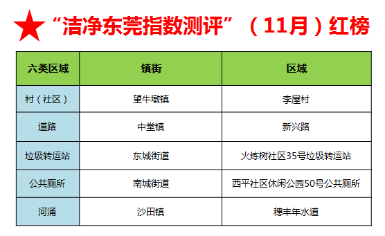 此外,根据机制测评(20%)评分细则,10月份、11月份横沥镇以及望牛墩镇的村(社区)登上“红榜”,各加5分,对其他区域登上红榜的凤岗、沙田、塘厦、中堂、茶山、东城6个镇(街)各加3分。值得表扬的是,沙田(10月垃圾转运站、11月河涌)和中堂(10月河涌、11月道路)连续两个月都登上了红榜。通过对前两个月登上“黑榜”的区域进行“回头看”,发现均整改较好,没有镇街扣分。