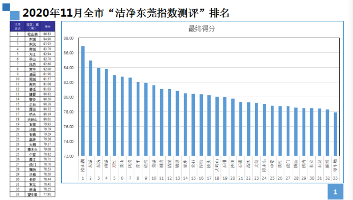 11月份排名前三的分别是松山湖、东城、东坑,排名后三的分别是望牛墩、麻涌、石龙,全市洁净指数平均分为80.61分,对比10月进步幅度最大的是企石、大岭山(均进步11名),降幅最大的是横沥(退步8名)。
