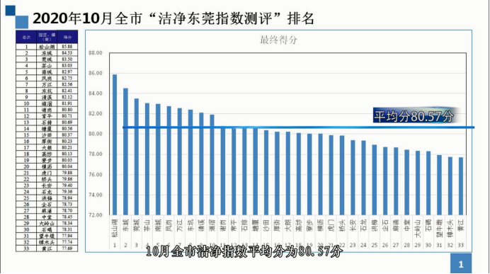 10月、11月 “洁净东莞指数测评”结果显示,10月份排名前三的分别是松山湖、东城、莞城,排名后三的分别是黄江、樟木头、望牛墩,全市洁净指数平均分为80.57分,对比9月进步幅度最大的是塘厦(进步17名),降幅最大的是大岭山(退步20名)。