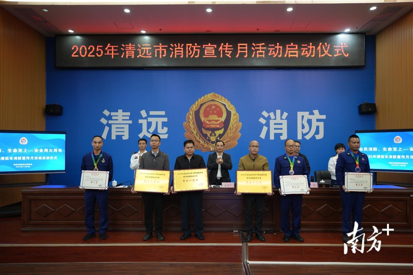 11月4日上午,清远市2025年消防宣传月启动仪式在市消防救援支队一楼举行。清远市委副书记黄建平宣布活动启动,清远市消防救援支队支队长全子厚部署村居消防救援能力提升工程。现场为乡镇专职消防队比武优胜队伍颁奖,并向偏远村居发放首批灭火拖车,标志着以“全民消防、生命至上”为主题的系列宣传活动全面启动。