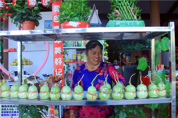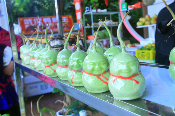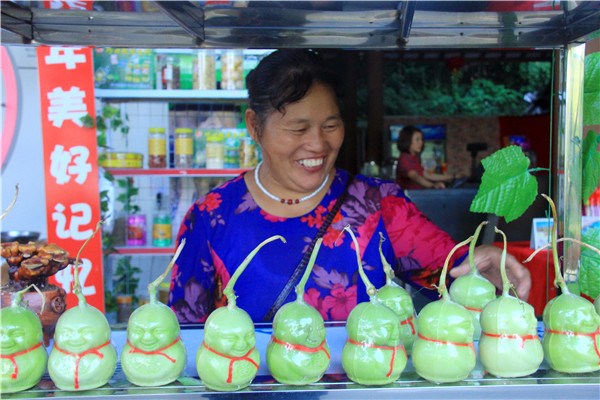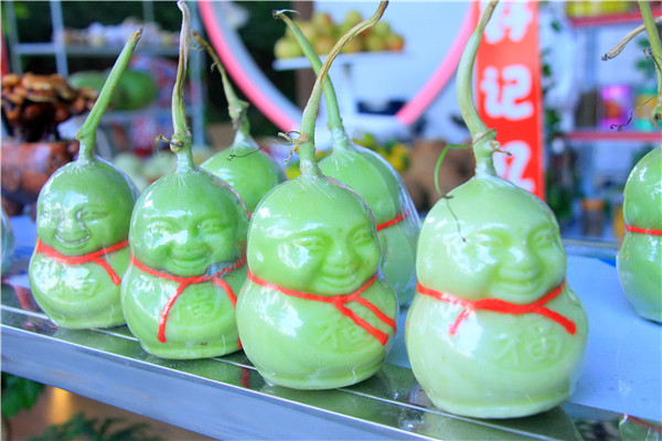 卖瓜农妇不但给游客送上可爱的“瓜娃娃”,而且还给游客送上祝福。在人形香瓜的脖子上系上一条红色的绳子,瓜娃娃的胸前还有福字,非常喜庆。瓜娃娃将双手藏在衣袖里,盘腿坐着,让人看后笑逐颜开。